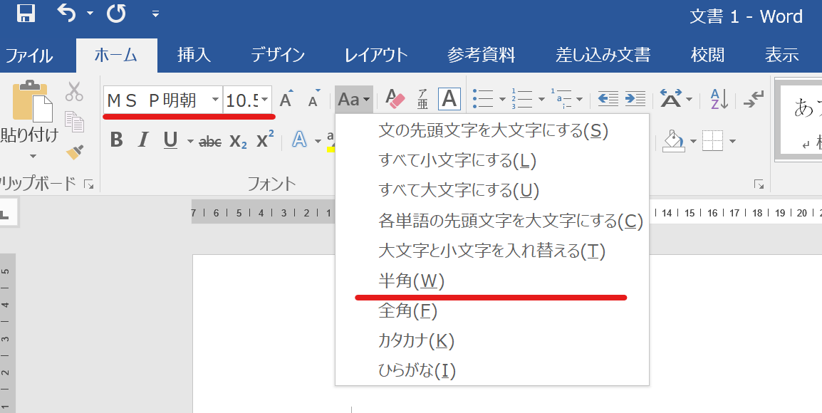 ホームタブのところにフォントの種類、サイズ、半角全角の切り替えを一括にできますのでやっておきましょう。半角英数字統一を行います。